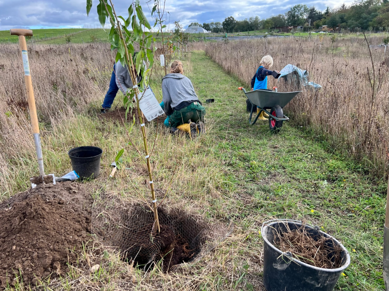 Außerdem entstand ein kleiner Waldgarten. In etwas geschützterem Rahmen können hier neben einheimischen und alten Sorten wie die Birne „Josephine von Mecheln“ oder der Apfel „Goldparmäne“ auch Klimawandelgehölze wie Pekannuss, schwarze Maulbeere und Lederhülsenbaum oder Mini-Kiwi und Baumhasel probiert werden. Im Verbund mit Wildsträuchern wie Felsenbirne, Ölweide, Waldhasel und zahlreichen Beerensträuchern wie Johannis- und Stachelbeeren.