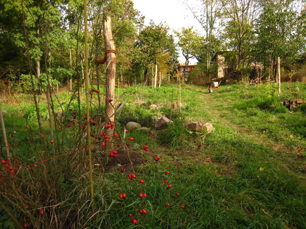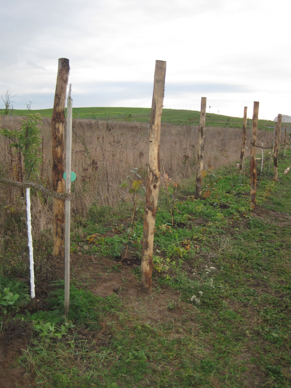 Die Beeren haben auch ein Spalier aus Robinienholz bekommen. Dies fügt sich auch optisch wunderbar in das bestehende Ensemble auf dem Acker ein.