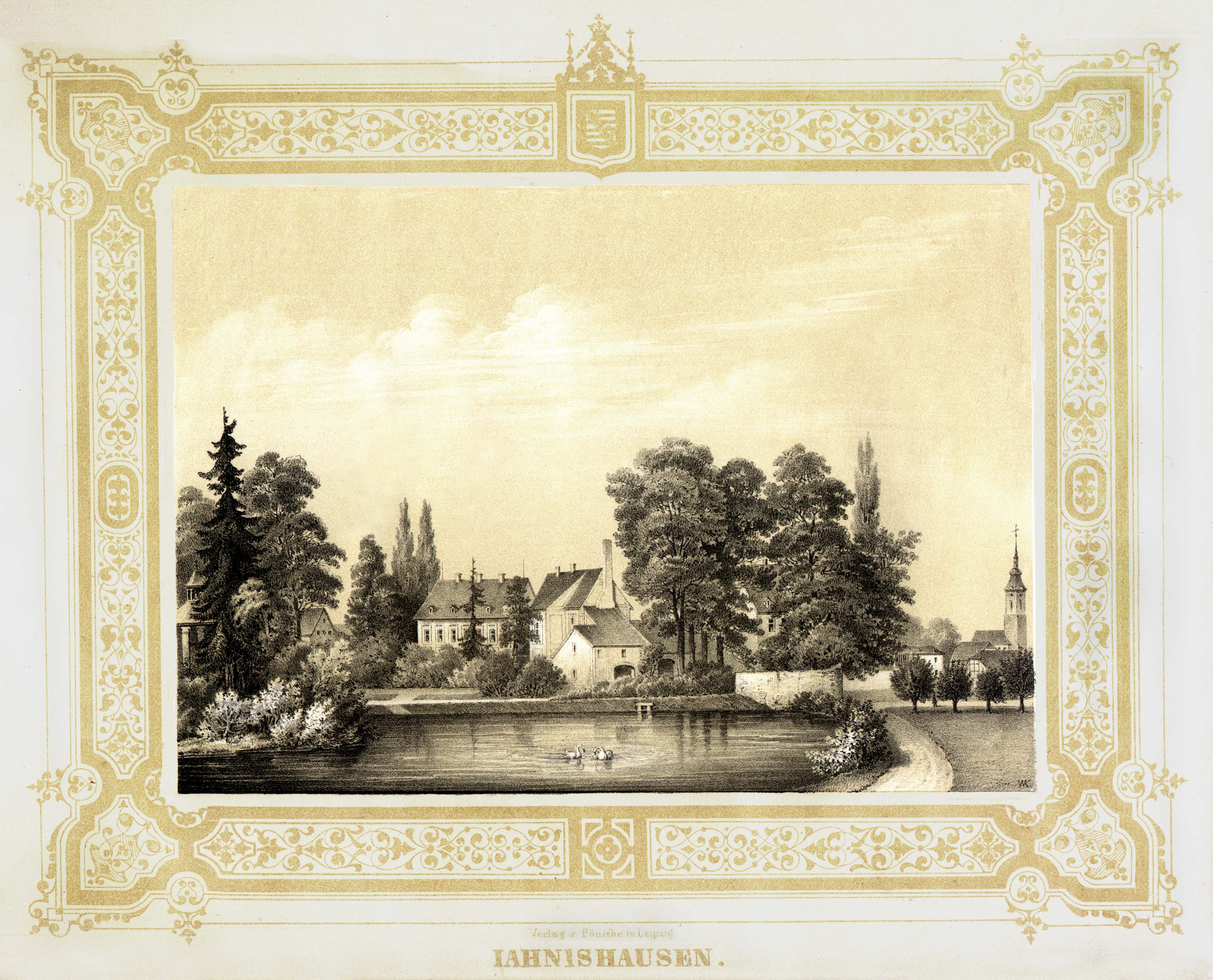 Schloss Jahnishausen, auch Jahnshausen, Johannishausen genannt, Rittergut im Dorfe gleichen Namenws, eine Stunde von Riesa und der Elbe und zwei Stunden von Lommatsch, in fruchtbarer Aue am Köpperitzbache und der Straße nach Grossenhayn gelegen, war früher lange Zeit im Besitz derer von Plötz, kam von diesen, zu Anfang des Laufenden Jahrhunderts, in den Besitz der Grafen von Hopfgarten und wurde 1825 von diesen an Se. königl. Hoheit, den Prinzen Johann, Herzog zu Sachsen, verkauft.