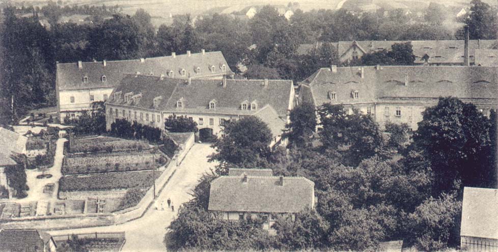 Rittergut Jahnishausen um 1900 Oben - Links Schloss Jahnishausen, teilweise verdeckt vom Kavaliershaus Ansichtskarte um 1900, Archiv ADJ