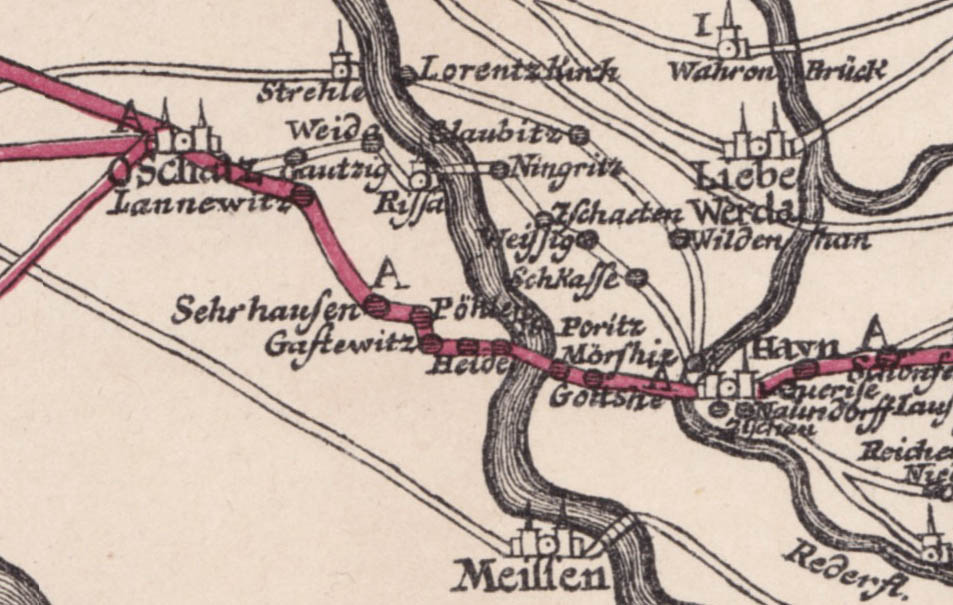 Oschatz - Lonnewitz (Lannewitz) - Seerhausen (Sehrhausen) - Böhlen (Pöhlen) - Gostewitz (Gastewitz) - Heyda (Heide) - Boritz (Ob[er] Poritz) - Merschwitz (Mörshiz) - Gottshe (Goltsche) - Großenhain (Hayn).